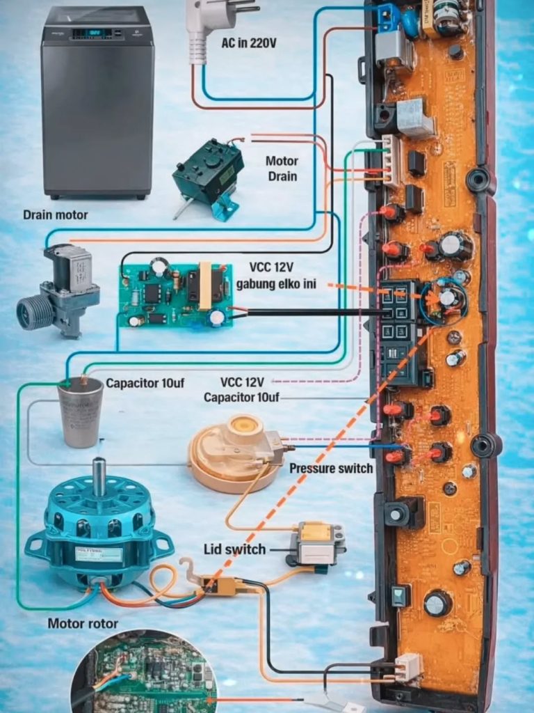 Memahami diagram kelistrikan pada unit indoor AC Split sangat krusial bagi teknisi maupun pemilik properti guna menjamin sistem pendingin ruangan bekerja dengan efisiensi maksimal. Komponen vital dalam sistem ini berpusat pada Main Circuit Board (PCB) yang berfungsi sebagai otak elektronik untuk mengontrol Indoor Fan Motor, memproses perintah dari Remote Controller, serta memantau kondisi suhu secara presisi. Arus listrik utama masuk melalui kabel Power Supply 220-240V AC, yang tegangannya kemudian diturunkan oleh komponen Stepdown Transformer agar aman dikonsumsi oleh Microcontroller dan berbagai sensor kontrol lainnya.
